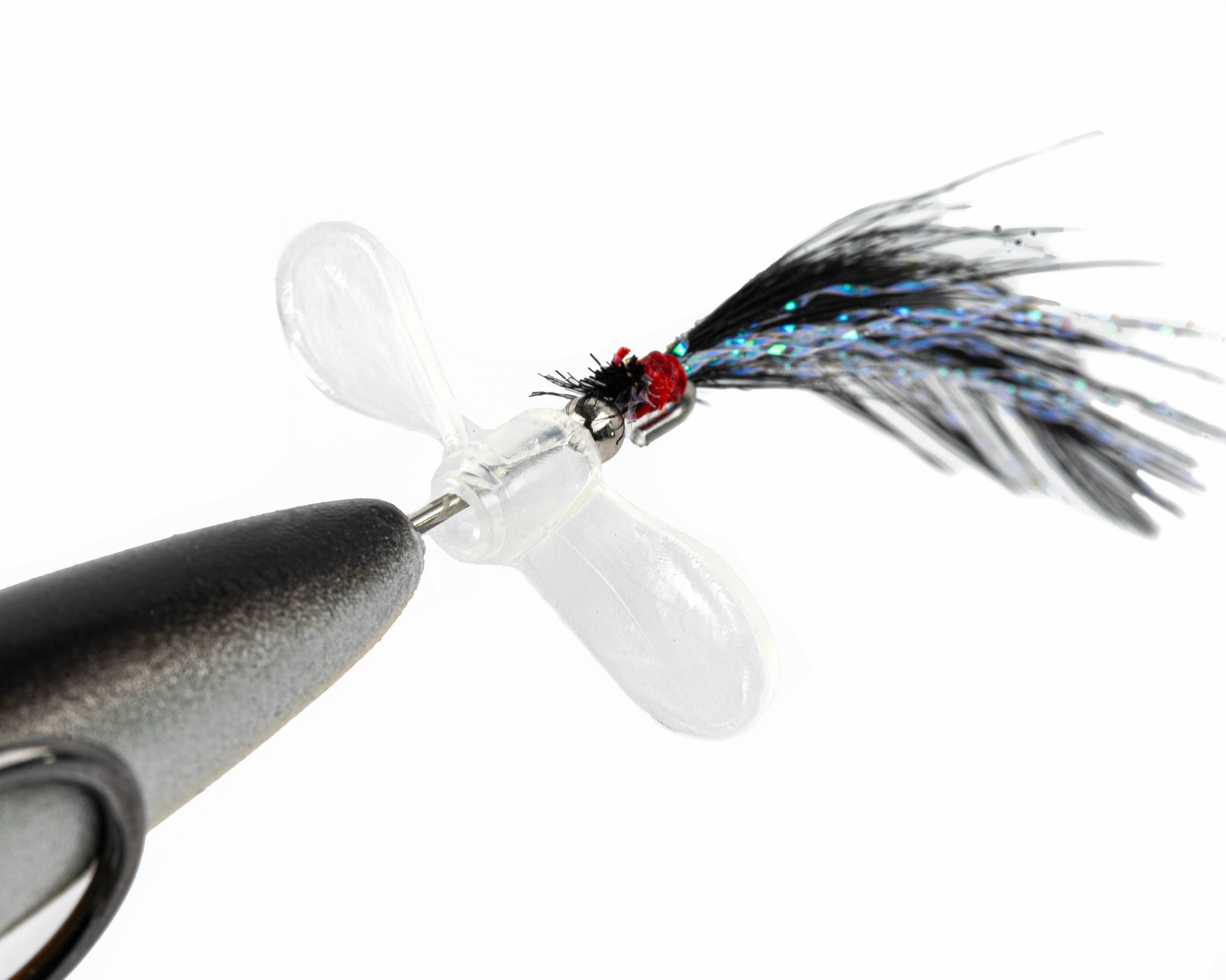 Clear Rear Prop: The clear, cupped prop is designed to grab more water and spin at slow speeds, generating an irresistible noise and bubble trail that entices fish.